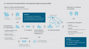 Die Berechnungen zeigen: Bei direkter Nutzung des Wasserstoffs ohne weitere Umwandlung kann der Einsatz von lokalem H2 ab 2030 sogar günstiger als ein Import sein. Während in Norddeutschland Kosten von rund 4 Euro abbildbar sind, würde etwa aus Tunesien importierter Wasserstoff mindestens 4,70 Euro pro Kilogramm kosten – jeweils zuzüglich Marge.